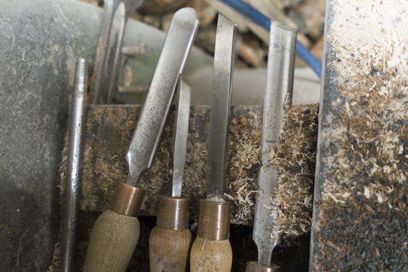 Ich arbeite vorwiegend an der Holzdrehbank und verarbeite vor allem einheimische und europäische Hölzer. Für kleinere Arbeiten, die es wegen der Farbigkeit und Festigkeit verlangen, greife ich in Ausnahmefällen auf Exoten aus aller Welt zurück.